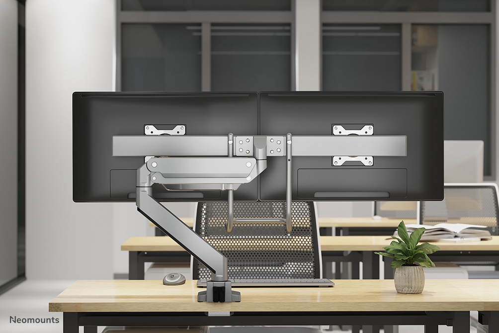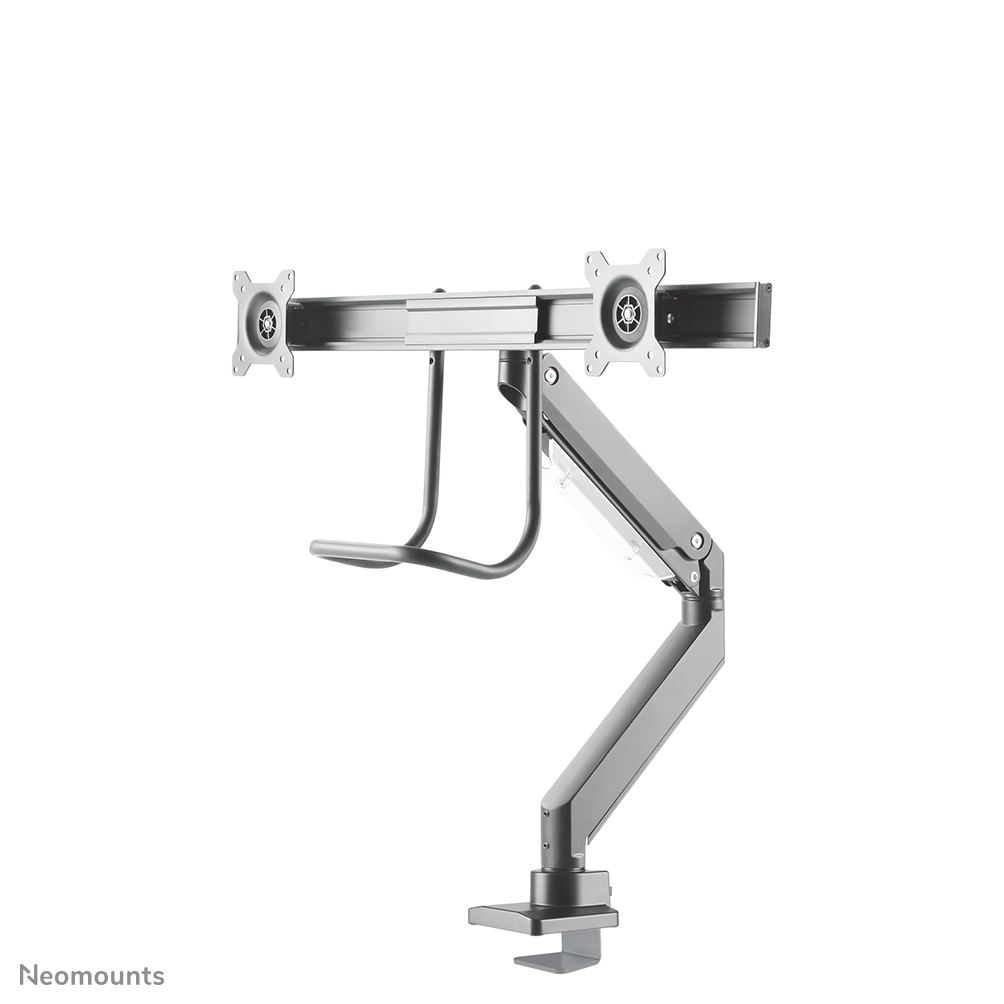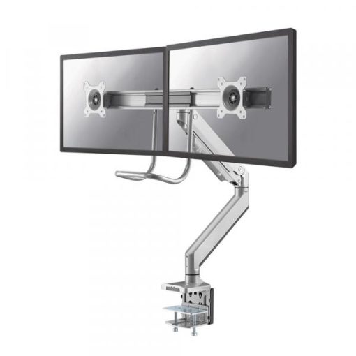 Met deze Neomounts monitorarm met hendel, model NM-D775DXSILVER, bevestigt u twee flatscreens aan het bureau via een bureauklem.