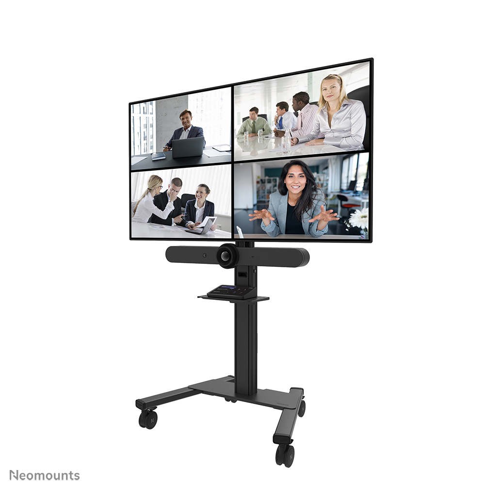 De Neomounts AFLS-825BL1 is een optionele videobar & multimedia kit voor de FL50S-825BL1 mobiele vloersteun. De kit maakt het mogelijk een separaat camera-plateau en multimedia-plateau op de trolley te installeren. Het universele camera-plateau kan zowel boven als onder het scherm worden geïnstalleerd en is in hoogte verstelbaar, zodat deze kan worden afgestemd op het scherm. Daarnaast kan het camera-plateau zowel aan de voor- en achterzijde van de trolley worden monteert. Bij de kit inbegrepen is een adapter voor de Logitech Rally Bar en Rally Bar Mini (ook plaatsbaar zowel boven en onder het scherm). Daarnaast is het multimedia-plateau geschikt voor installatie van o.a. de Logitech Tap.