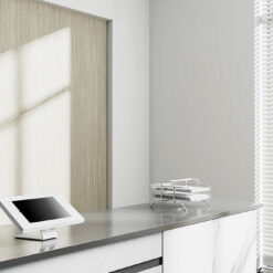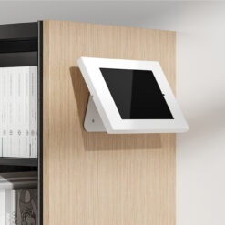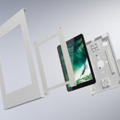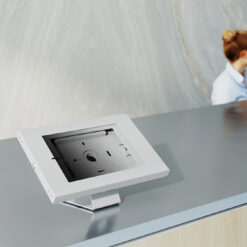 De tablethouder is voorzien van een anti-diefstalslot en kan zowel op een tafelblad als aan de muur worden geïnstalleerd. Anti-slipkussentjes in de casing beschermen de tablet tegen eventuele krassen en de stalen constructie zorgt voor een veilige en solide plaatsing. Het kabelmanagementsysteem maakt het mogelijk om kabels door de casing te geleiden.