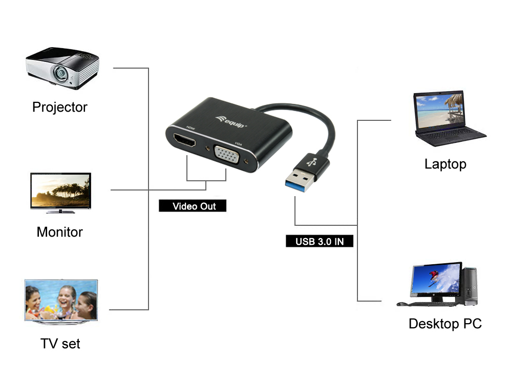 Equip 133386 USB 3.0 to HDMI/VGA (HD15) Adapter, 3.2 Gen 1, USB Type-A, HDMI output, 1920 x 1080p
