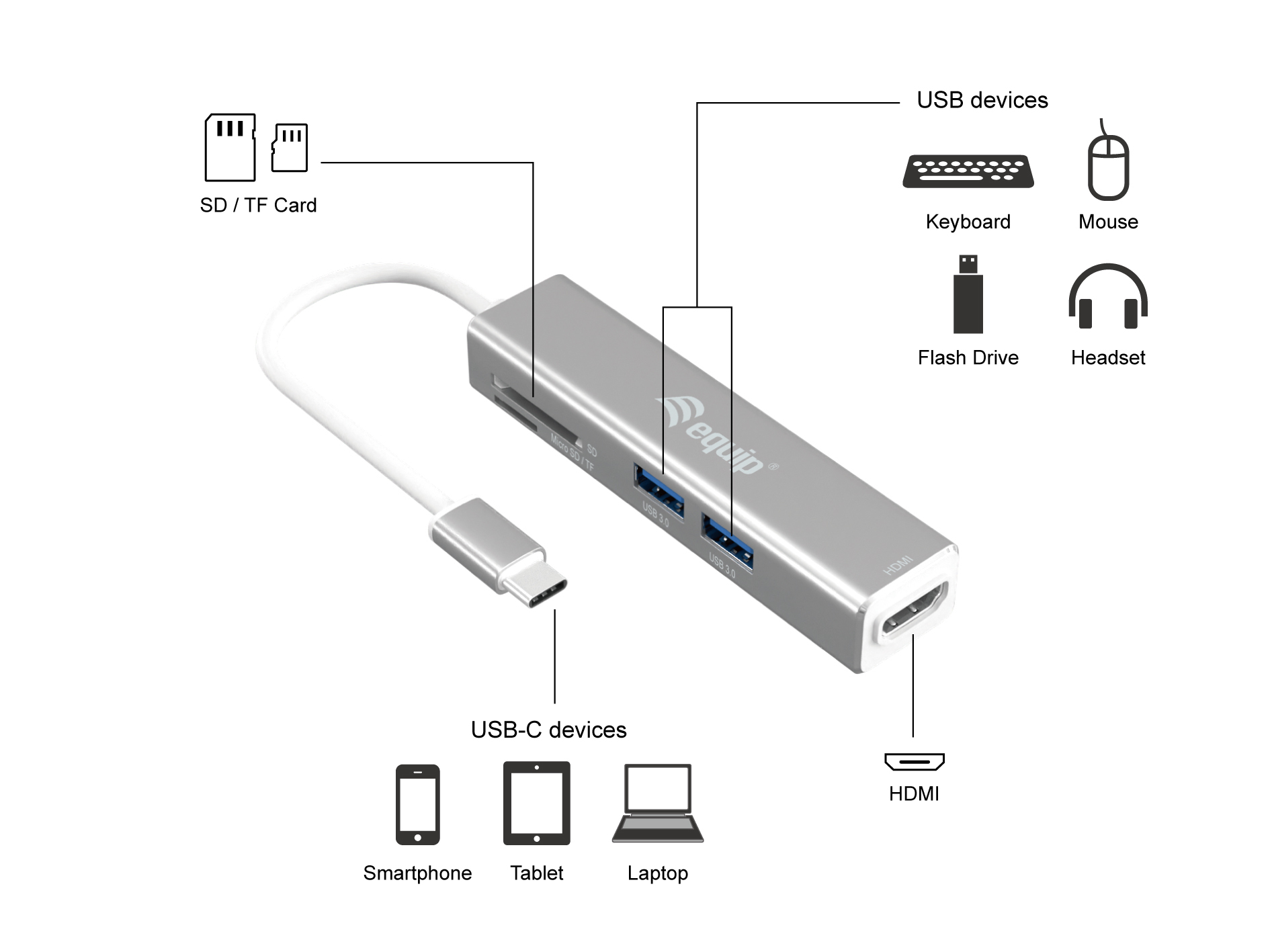 Equip 13348007101 USB-C 5 in 1 Multifunctional Adapter, USB 3.2 Gen 1, USB Type-C, 4K UHD