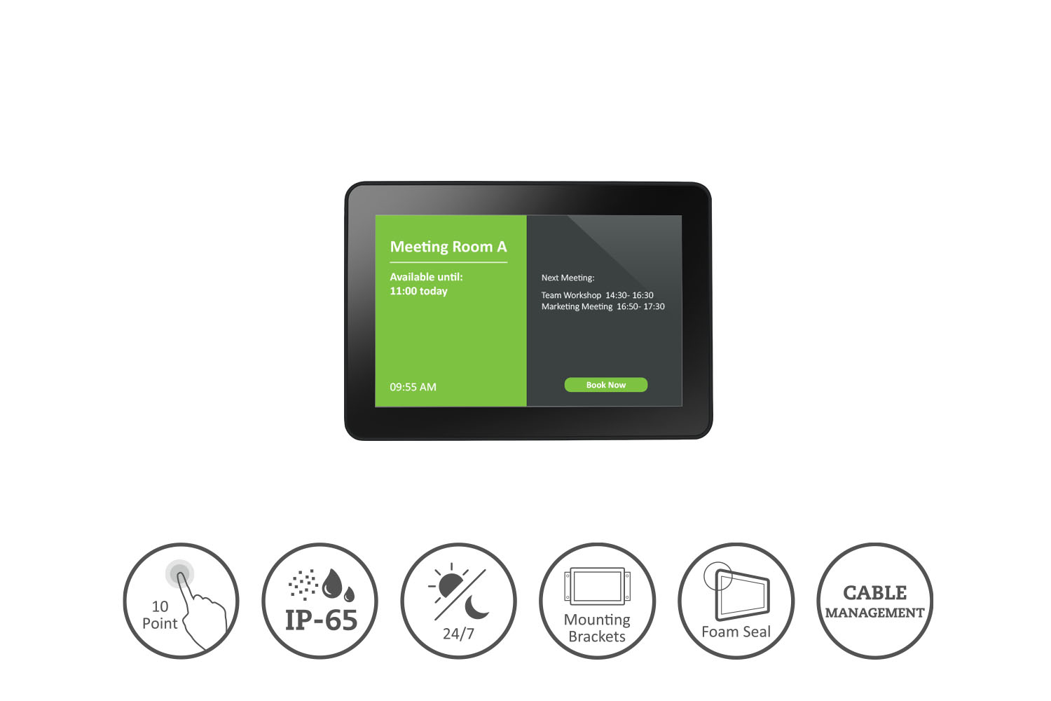 The TX-10 Multi-touch Interactive Display, with its 10.1-inch, 10-point touch screen, brings the experience of a tablet into the form factor of a monitor. Its foam seal design supports seamless integration into kiosks and its front-side IP65 rating protects the screen from dust and water. External mounting brackets are provided for installation in a wide variety of application environments—in a meeting room as a scheduling display, or in a number of public, commercial, and industrial interactive applications. Allowing for either landscape or portrait orientation, the TX-10 multi-touch interactive display is the perfect fit.