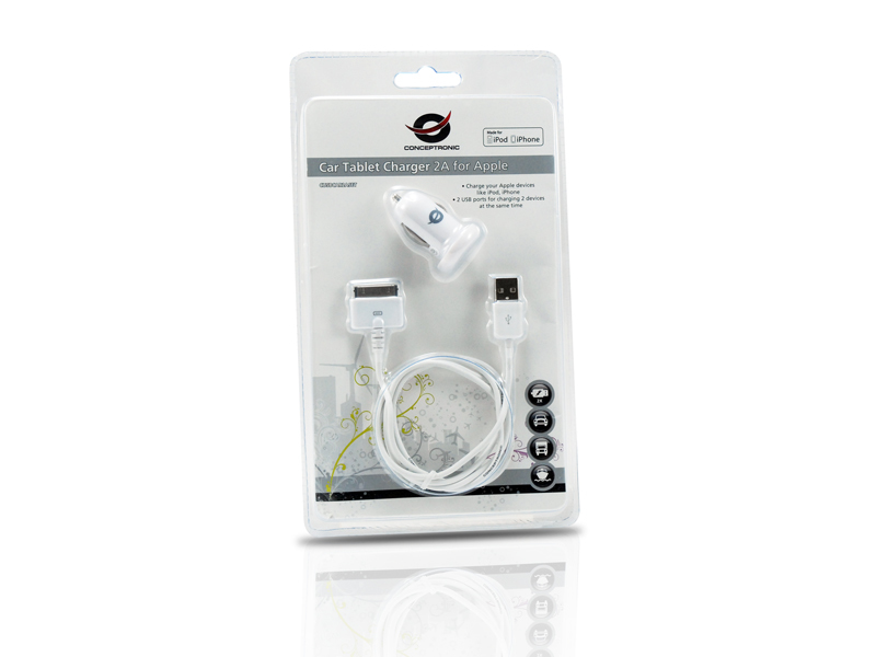 Conceptronic CUSBCAR2ASET Car Tablet Charger 2A for Apple, Cigar lighter, White