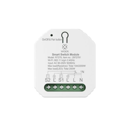 This WOOX R7279 Smart Switch 2-gang module is the professional brother of our bestseller R4967. Both devices make traditional switches obsolete. The WOOX R7279 smart switch 2-gang module is a fuse and wireless switch that you can incorporate into an electrical circuit and insert 2-gang ways. Consider, for example, the wiring of an electrical outlet. When the smart switch is mounted in such an electrical circuit, you can remotely switch the relevant socket on and off via your smartphone. This means that the light switch against the wall will become completely unnecessary in the long run.