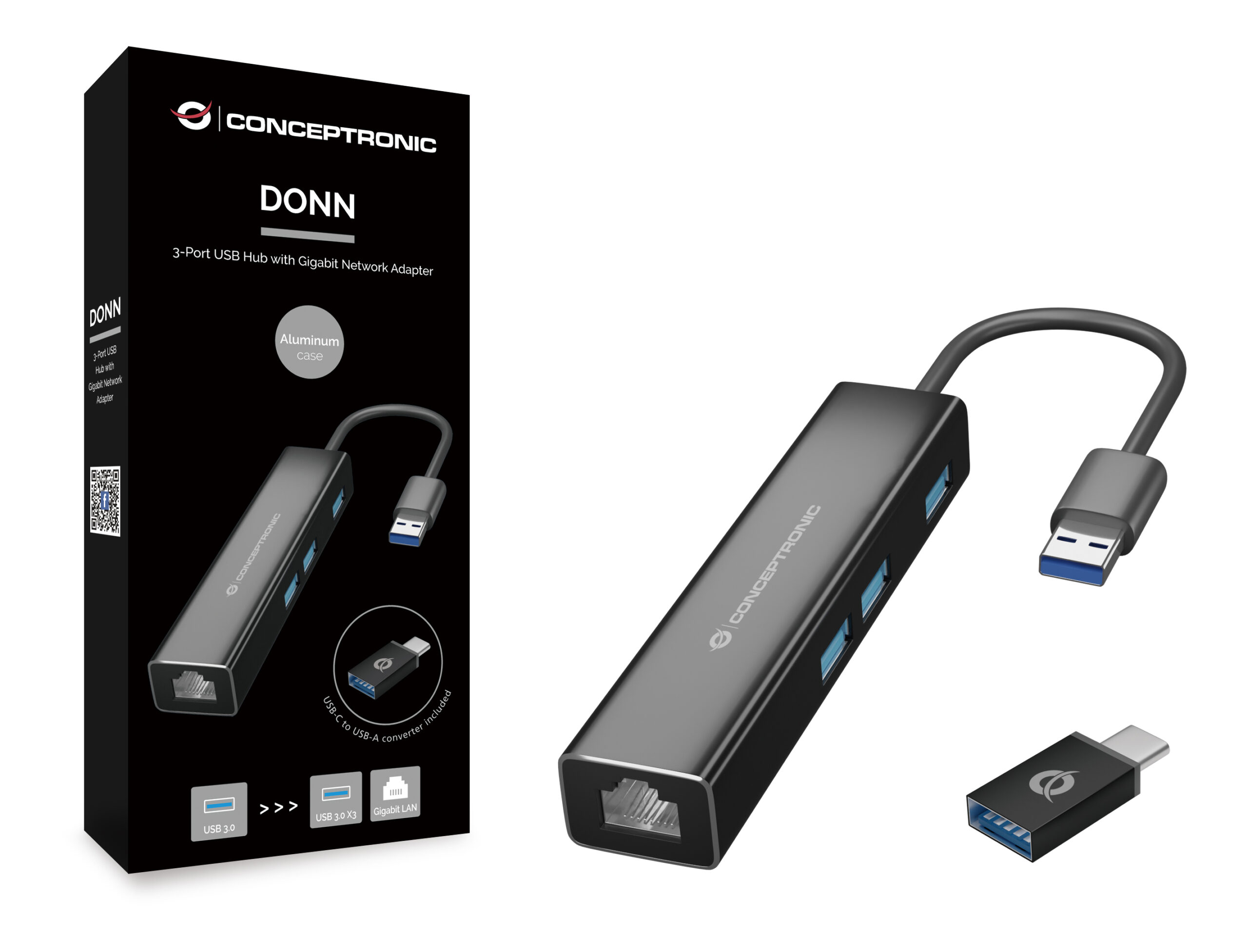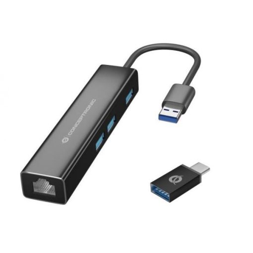 Conceptronic DONN07BA USB 3.2 Gen 1 Type-A, 10,100,1000 Mbit/s, Black, RJ45, USB 3.2 Gen 1 Type-A