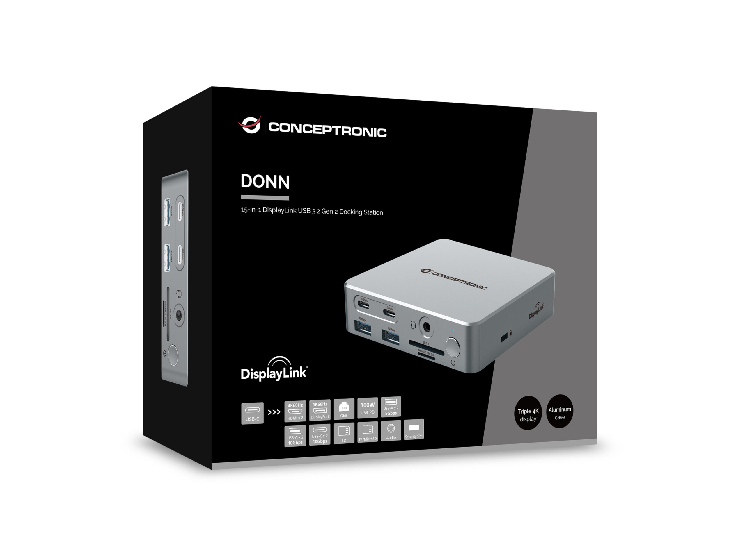 Conceptronic DONN25G 15-in-1 DisplayLink USB 3.2 Gen 2 Docking Station, Triple 4K60Hz, HDMI, DP, USB